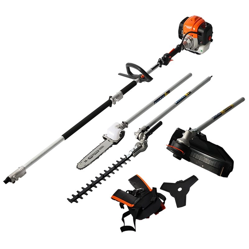 La conception modulaire comprend une tête de brosse en nylon, un disque à 3 points, un taille-haie de 400 mm et une tête d’élagage avec une barre et une chaîne de 10″, ce qui vous permet de changer de fonction selon la tâche à accomplir.